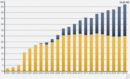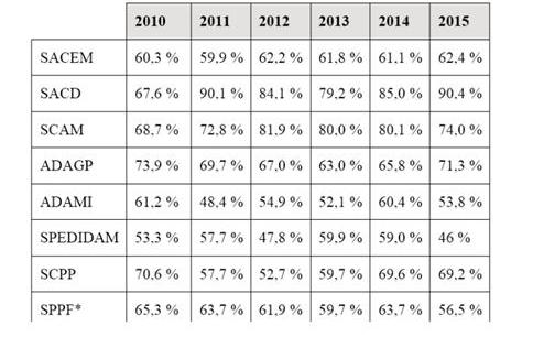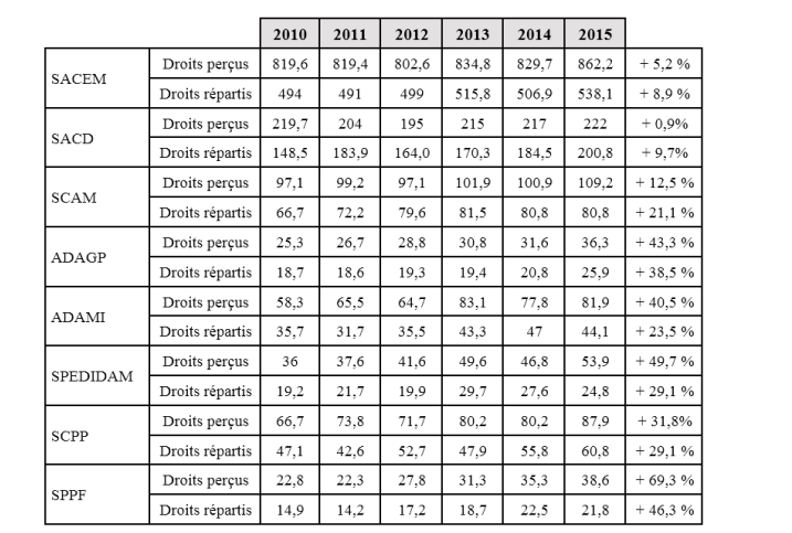 تابلو 1 : تغییرات و تحولات حقوق دریافتی و حقوق توزیع شده توسط شرکت های مدیریت جمعی (2015-2010). اعداد به میلیون یورو می باشند.